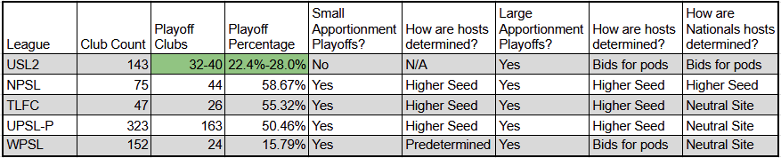 The radical part of this thought process is doubling the number of Regions from 4 to 8. I am also suggesting a formula of some kind be made in the allocation of playoff bids and creation of playoff wildcards. This is to eliminate human bias and human input in the handling of wildcards in USL2. This new playoff format would limit playoffs bids to 4 per Region. Except in Regions deemed “large,” where an additional 5th seeded wildcard team would be added. The determination of what constitutes a “large” number of teams would be a predetermined, non-changing amount. (Green fill means that cell is changed)