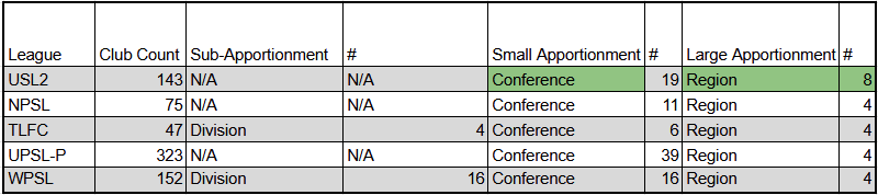 To start, the first thing we will do is change the nomenclature of the league. USL2 Divisions will now be called Conferences to conform with the rest of the similar leagues. USL2 Conferences will now be called Regions, once again, to conform with the rest of the similar leagues. This means that the USL2 naming convention will now go Conference -> Region -> National/League. This will match exactly to NPSL and UPSL and match mostly with TLFC and WPSL. (Green fill means that cell is changed)