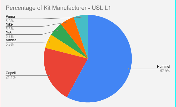38.5% or 20 teams use Hummel as their kit provider - making them the largest in the USL. In second we have Capelli at 21.2% or 11 teams. Now that is very interesting. Capelli has not been a league wide since 2018 (announcement here from 2018). A lot has changed since 2018. Now Capelli is the Official Uniform and On-Field Provider for the USL Super League (link), but I would argue that Capelli has made it’s biggest gains on the men’s side. Charly is the Official Uniform and On-Field Provider for USL-C, L1. Yet sit behind Capelli.